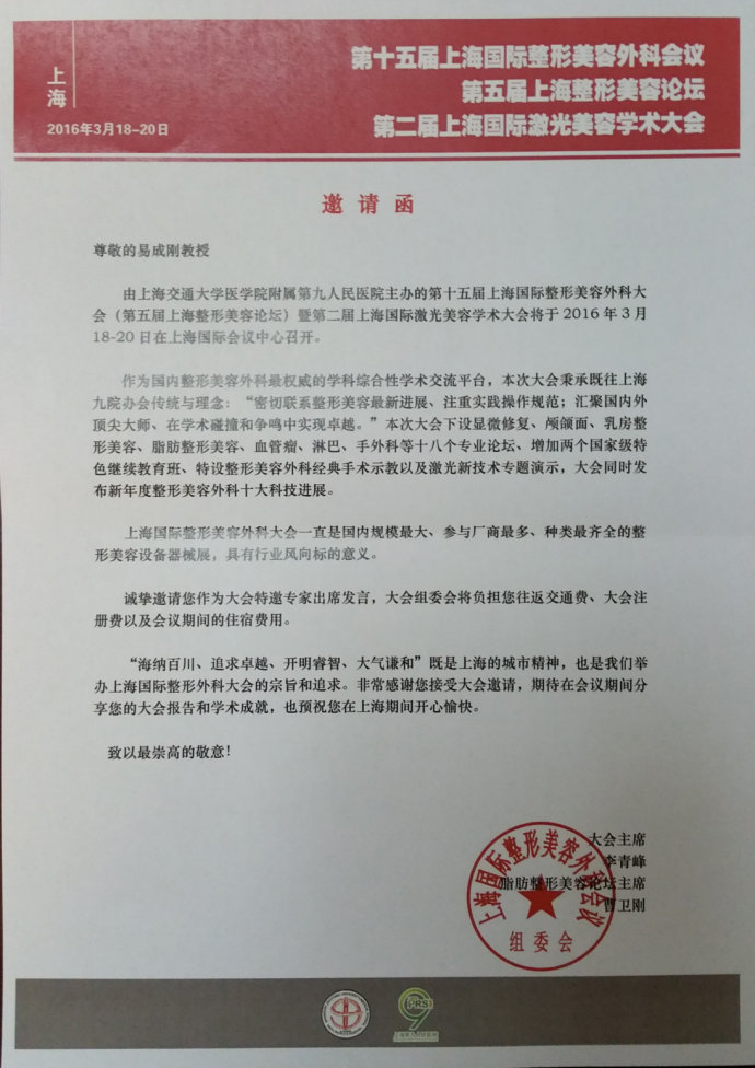 很榮幸受上海第九人民醫(yī)院李青峰教授、曹衛(wèi)剛教授的邀請,易成剛教授參加了2016年3月1820日第十五屆上海國際整形美容外科會議,在會議中報告了在自體脂肪移植的基礎(chǔ)與臨床研究,乳房整形最新技術(shù),及自體脂肪在乳房整形中的應(yīng)用等內(nèi)容,并與日本東京大學(xué)Yoshimura教授、宋建星教授一起主持了自體脂肪移植面部應(yīng)用的內(nèi)容。