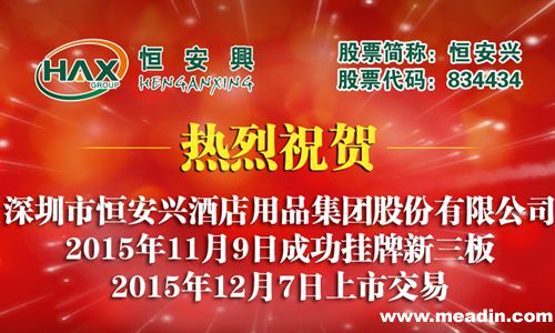11月9日深圳市恒安興酒店用品集團(tuán)股份有限公司收到全國(guó)中小企業(yè)股份轉(zhuǎn)讓系統(tǒng)同意其掛牌的函,12月7日正式掛牌上市交易(簡(jiǎn)稱:恒安興,股票代碼:834434),深圳市恒安興酒店用品集團(tuán)股份有限公司也成為中國(guó)酒店用品行業(yè)首家登陸新三板的企業(yè),也是建筑裝飾業(yè)首家專注于高端酒店全域空間軟裝飾方案提供的新三板企業(yè),同時(shí),恒安興也是中國(guó)酒店用品行業(yè)首家登陸國(guó)內(nèi)資本市場(chǎng)的企業(yè)。