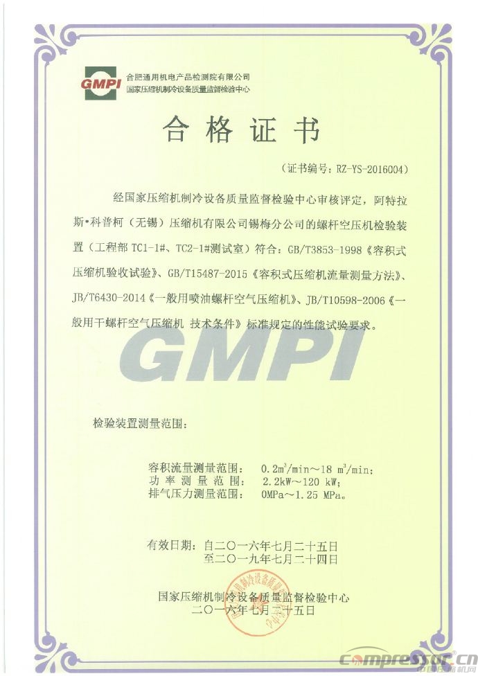 ???? 近日,阿特拉斯·科普柯壓縮機(jī)工程部部分實(shí)驗(yàn)室與生產(chǎn)部部分試車(chē)間,經(jīng)合肥通用機(jī)電檢測(cè)院關(guān)于空壓機(jī)實(shí)驗(yàn)裝置及平臺(tái)審核測(cè)試后,于2016年7月25日獲得了空壓機(jī)實(shí)驗(yàn)裝置合格證書(shū)。質(zhì)量的保證來(lái)自權(quán)威的認(rèn)證!阿特拉斯·科普柯穩(wěn)定動(dòng)力來(lái)源!