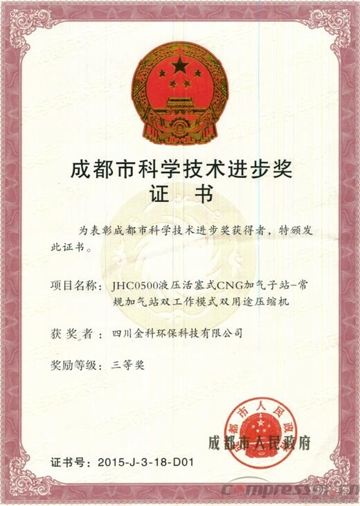 ??????? 金星股份四川金科環(huán)??萍加邢薰咀灾餮邪l(fā)的“JHC0500液壓活塞式CNG加氣子站常規(guī)站雙工作模式雙用途壓縮機(jī)”產(chǎn)品,獲得了2015年成都市科技進(jìn)步三等獎(jiǎng)。