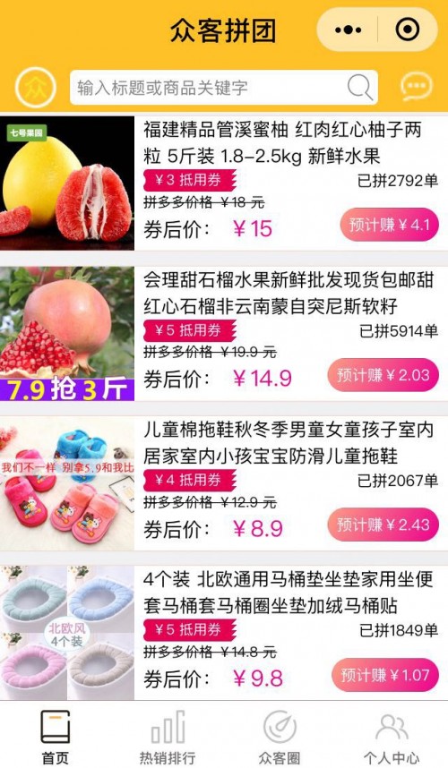 眾客拼團(tuán)是基于拼多多與京東的一款微信小程序,目標(biāo)就是讓人人得到實(shí)惠。為了實(shí)現(xiàn)這點(diǎn),眾客拼團(tuán)選擇直接站在巨人的肩膀上為用戶創(chuàng)新謀福利。