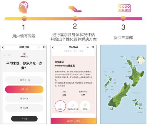 Wondermins是來自新西蘭的個(gè)性化營(yíng)養(yǎng)補(bǔ)充包,這種新型的營(yíng)養(yǎng)補(bǔ)充方式是以用戶的個(gè)人營(yíng)養(yǎng)需求為中心,根據(jù)用戶的年齡、性別、飲食方式、生活環(huán)境、病史、鍛煉水平等,個(gè)性化定制最適合個(gè)體的營(yíng)養(yǎng)素補(bǔ)充包。