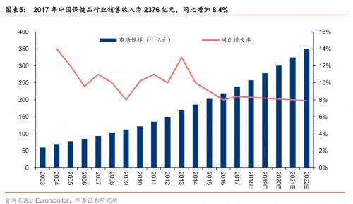根據(jù)Euromonitor的統(tǒng)計(jì),2017年中國(guó)保健品行業(yè)銷售收入達(dá)2376億元,同比增長(zhǎng)8.4%。中國(guó)保健品市場(chǎng)的增長(zhǎng)速度較快,2002年行業(yè)銷售收入僅為442億元,2002~2017年行業(yè)銷售收入的復(fù)合增速達(dá)到11.86%,預(yù)計(jì)2020年市場(chǎng)規(guī)模將有望達(dá)到3500億元。