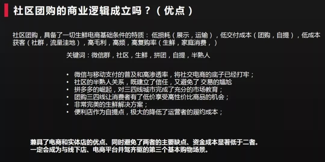 第一個是熟人關(guān)系,社區(qū)團購從來不是熟人關(guān)系,我說在中國熟人之間怎么做生意呢?在中國熟人是沒法做生意的,做不出來好生意,什么生意好做呢?就是半熟人,同鄉(xiāng),發(fā)現(xiàn)突然有一個和你一個地方來的老鄉(xiāng),你的第一反應是什么?倍感親切,這個社區(qū)的原因也就在這兒,都是一個社區(qū)的,所以說他天然能夠解決掉的是陌生人的不信任感,同時又避免了熟人的尷尬,既是同鄉(xiāng),同時該怎么做生意就怎么做生意。第二個是搬運,整個生鮮搬運從產(chǎn)地到銷地批發(fā)市場到社區(qū),多次搬運成本是巨大的,很快顏色就會不好看了,所以過去生鮮的成本都卡在這里。第三個是配送,最后一公里配送成本是很高的,現(xiàn)在通過集中配送到團長那里,消費者自提,也就是說最后一公里沒有太多的成本。整個中間環(huán)節(jié)運輸?shù)膿p耗和運輸?shù)某杀疽呀?jīng)被壓縮到極低的概念,意味著生鮮的高毛利就會帶來巨大的爆發(fā)潛力。