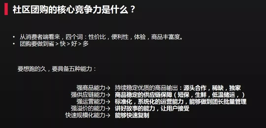 大家都說運營體系,我來看整個核心競爭力只有一個就是商品,沒別的,所謂其他一切都是圍繞著商品來做的服務,你的供應鏈組織,團長對用戶的運營都是虛的,就是商品,什么商品?叫做精品商品,不是菜市場的商品,是全球頂級好貨,供應鏈高效組織,迅速到達社區(qū)消費者手里,能不能把頂級的商品用合適的價格賣給消費者才是關(guān)鍵。