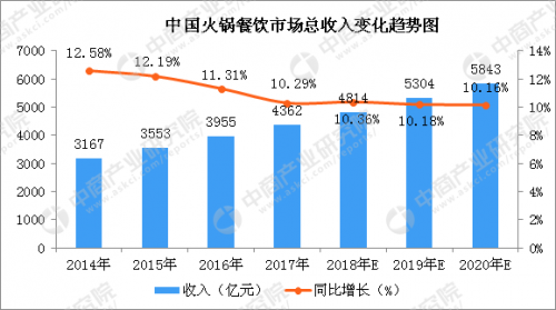 近年來,火鍋餐廳市場增長迅速。據(jù)數(shù)據(jù)統(tǒng)計顯示:我國火鍋餐飲市場總收入由2014年3167億元增長至2017年4362億元,復合年增長率為8.3%?;疱伈惋嬕蚴芤嬗谄涫軞g迎程度及其可擴張性與高度標準化的獨特業(yè)務模式,預期在2020年收入增加至5843億元。