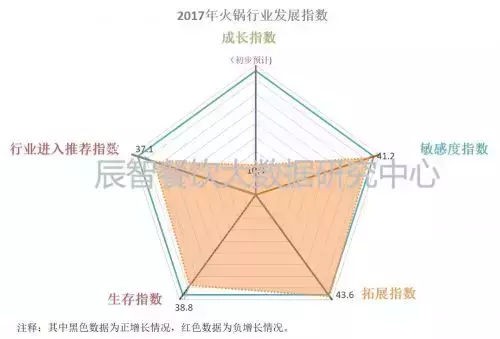 火鍋在中國有上千年的歷史,可謂是長盛不衰的典型代表,層出不窮的火鍋店遍布全國各地、街頭巷尾,占據(jù)著我國餐飲消費市場半壁江山。根據(jù)2017年度火鍋行業(yè)餐飲門店及消費情況,我們發(fā)現(xiàn):2017年度火鍋行業(yè)的整體成長指數(shù)為10.3,與整體餐飲行業(yè)趨勢一致;火鍋行業(yè)拓展指數(shù)為43.6,相對較高;火鍋門店的生存指數(shù)在38.8,相對較低;對于該行業(yè)的進入推薦指數(shù)為37.1,處于“謹慎進入”階段,而火鍋整體行業(yè)目前呈現(xiàn)規(guī)模萎縮,從量的增長向質(zhì)的增長過度,行業(yè)資源流動性高,整體處于消費升級階段。