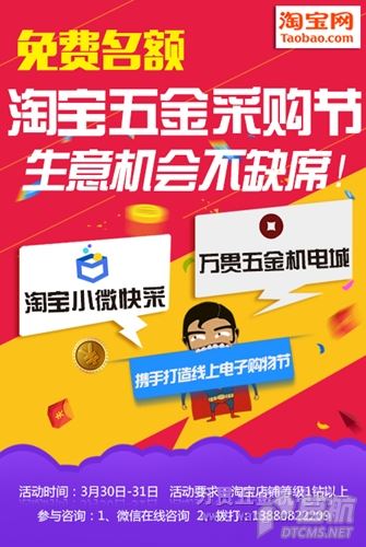 據(jù)悉,2016年3月284月1日,淘寶與萬貫共同舉辦2016萬貫春季采購節(jié)暨“淘寶五金”萬貫專場采買會,開展線上線下大促銷活動。3月30至31日,淘寶網(wǎng)“企業(yè)購”淘寶五金欄目開辟“萬貫春季采購節(jié)專場采買會”(采購地址:http://dwz.cn/303vFU),推行線上線下聯(lián)動促銷,開展1元秒殺、進(jìn)店送優(yōu)惠券等活動,以此拓寬萬貫商家銷售渠道,助力他們把握“互聯(lián)網(wǎng)+”機(jī)遇,方便五金采購商線上選購。