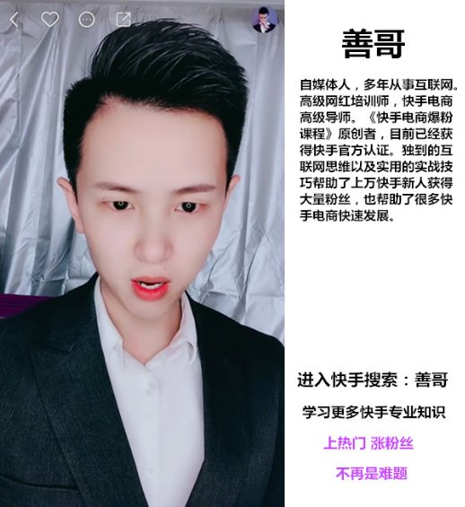 主播善哥,每天直播和新手講解快手電商知識(shí)。幫助新手快速成長(zhǎng)??焓炙阉?善哥 ,分享月漲18萬(wàn)粉絲的經(jīng)驗(yàn),學(xué)習(xí)快手電商爆粉課程,一切都變得非常輕松。