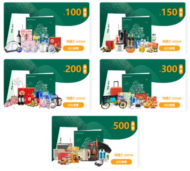 提供100、150、200、300、500 共5檔標(biāo)準(zhǔn)套餐,企業(yè)可以根據(jù)預(yù)算自由選擇;可為企業(yè)定制任何檔位的套餐,亦支持實(shí)物團(tuán)購(gòu),形式靈活,滿足不同企業(yè)的多樣需求。每檔標(biāo)準(zhǔn)套餐提供十大品類共100多款精選商品,涵蓋粽子禮盒、休閑零食、糧油干貨、家居日用、實(shí)用小家電等,還有多款超值電商券,員工可自由兌換禮品。