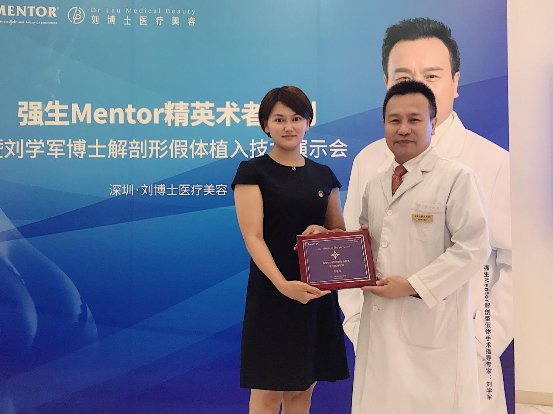強(qiáng)生MENTOR深圳區(qū)負(fù)責(zé)人林沁嵐女士授予劉學(xué)軍博士“強(qiáng)生MENTOR解剖型假體手術(shù)指導(dǎo)專家”榮譽(yù)