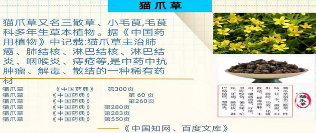 據(jù)有關文獻記載:貓爪草可以有效預防和治療淋巴系統(tǒng)疾病。對淋巴結炎,淋巴結合,肺炎,肺結核,乳腺增生,子宮肌瘤,甲狀腺結節(jié),前列腺增生、肥大,神經性疼痛,咽炎,痛風,囊腫等有獨特的預防和治療效果,同時還有保肝護肝的作用。是中藥中抗腫瘤、解毒、散結的一種好藥材,被譽為“人體的清道夫”。