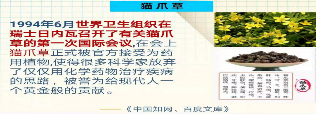 1994 年6 月世界衛(wèi)生組織在瑞士日內瓦召開了有關貓爪草的第一次國際會議,在會上貓爪草正式被官方接受為藥用植物,被譽為給現(xiàn)代人一個黃金般的貢獻。大量的對這一威力極大的草本植物所作的研究,使得許多科學家放棄了僅僅使用化學藥物治療疾病的思路。