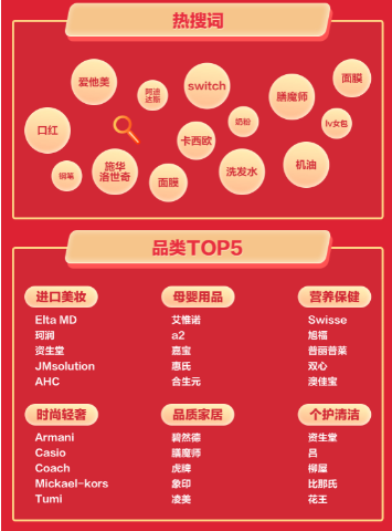 本次“海囤全球日”,消費者最為關(guān)注的產(chǎn)品是什么?京東大數(shù)據(jù)顯示,愛他美、口紅、switch、施華洛世奇、卡西歐、膳魔師、洗發(fā)水、面膜成為熱搜關(guān)鍵詞,來自日本、美國、韓國三個國家的產(chǎn)品分列成交額前三甲。熱銷品類TOP5排名中,進口美妝一騎絕塵,母嬰用品分毫不遜,營養(yǎng)保健步步緊逼。