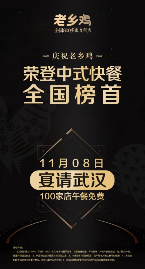 2019年11月5日,“老鄉(xiāng)雞榮登中式快餐全國(guó)第一暨武漢市場(chǎng)戰(zhàn)略聯(lián)盟發(fā)布會(huì)”在武漢知音號(hào)上隆重召開,發(fā)布會(huì)現(xiàn)場(chǎng)碧桂園、綠地、萬(wàn)科、東湖高新、居然之家、歐亞達(dá)、億事達(dá)、橋七、三合、悅聯(lián)商業(yè)等10多家知名房地產(chǎn)簽訂戰(zhàn)略合作聯(lián)盟。2019年10月,在中國(guó)烹飪協(xié)會(huì)發(fā)布“中國(guó)快餐企業(yè)70強(qiáng)”榜單上,老鄉(xiāng)雞與麥當(dāng)勞、肯德基、漢堡王等國(guó)際知名品牌同時(shí)進(jìn)入四強(qiáng),并位列于中式快餐排名榜首,真正成為全國(guó)中式快餐第一品牌,也是中國(guó)快餐品牌發(fā)展的里程碑。