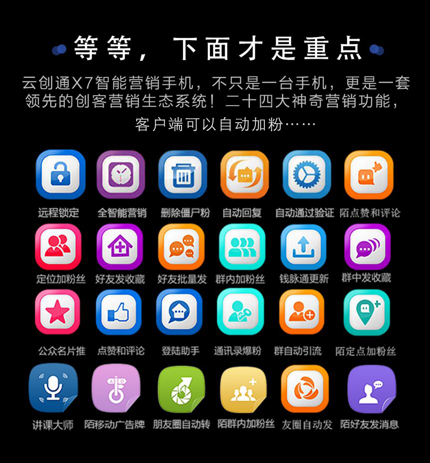 云創(chuàng)通X7創(chuàng)客智能營銷手機(jī),一款可以幫你拓寬商品銷路的神器,擴(kuò)展人脈,幫你維護(hù)好和客戶的關(guān)系。如今你還要坐以待斃嗎?關(guān)注王鵬微信(whx923)。