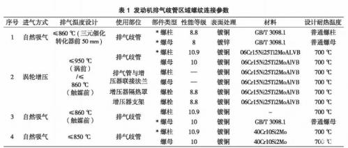 連接件的工作環(huán)境,高溫會(huì)使材料的缺口敏感性增加,會(huì)提高螺栓斷裂的可能性。為了了解本企業(yè)設(shè)計(jì)師在這些部位螺栓的選用情況,從企業(yè)產(chǎn)品庫(kù)中抽取了四款發(fā)動(dòng)機(jī),排氣歧管周邊區(qū)域螺紋連接使用情況見(jiàn)表1。