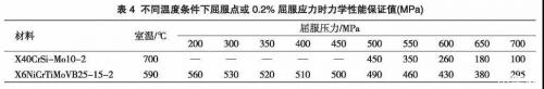 表4為X40CrSiMol0-2和X6NiCrTiMoVB25-15-2在不同溫度條件下屈服點(diǎn)或0.2%屈服應(yīng)力時(shí)的力學(xué)性能保證值,通過(guò)觀察表4可以看到X40CrSiMol0-2在室溫下屈服強(qiáng)度或0.2%屈服應(yīng)力為700MPa,在700℃時(shí)衰減為100MPa,衰減比較明顯;
