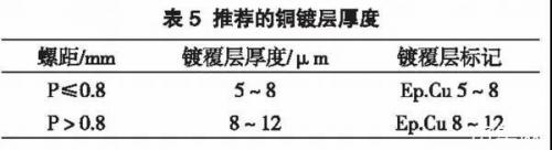 銅的熔點(diǎn)為1083℃左右,在高溫環(huán)境下,可以避免螺紋件燒結(jié),給維修和拆卸造成不便。對(duì)于發(fā)動(dòng)機(jī)排氣部位的緊固件,使用鍍銅主要就是為了解決高溫?zé)Y(jié)的問(wèn)題。此外,發(fā)動(dòng)機(jī)耐熱螺栓的表面處理方式還可以選擇Magni504或二硫化鉬。關(guān)于銅鍍層的厚度,可以參考表5(數(shù)據(jù)源自QJ450B-2005)。