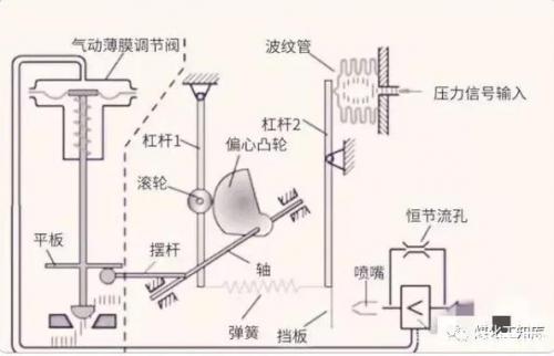 當(dāng)控制器輸出的電信號轉(zhuǎn)變?yōu)榕c之相對應(yīng)的氣信號時,然后將轉(zhuǎn)換后的氣信號作用在波紋管上。杠桿2則繞著支點(diǎn)運(yùn)動,杠桿2下段向右運(yùn)動靠近噴嘴。噴嘴的背壓增加,經(jīng)過氣動放大器放大后(圖中那個帶小于符號的部件),將氣源的一部分送入到氣動薄膜的氣室,閥桿帶著閥芯向下自動逐漸將閥門開度變小。此時,與閥桿相連的反饋桿(圖中擺桿)繞著支點(diǎn)向下移動,使軸的前端向下移動,與其連接的偏心凸輪做逆時針旋轉(zhuǎn),滾輪順時針旋轉(zhuǎn)向左移動,從而拉伸反饋彈簧。由于反饋彈簧拉伸杠桿2下段向左移動,此時就會與作用在波紋管上的信號壓力達(dá)到力平衡,于是閥門就固定在某個位置不動作了。