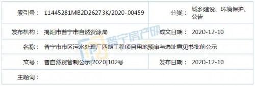 近日,依照《廣東省城鄉(xiāng)規(guī)劃條例》第二十九條規(guī)定,普寧市自然資源局發(fā)布了普寧市市區(qū)污水處理廠(chǎng)四期工程項(xiàng)目用地預(yù)審與選址意見(jiàn)書(shū)批前公示,具體內(nèi)容如下: