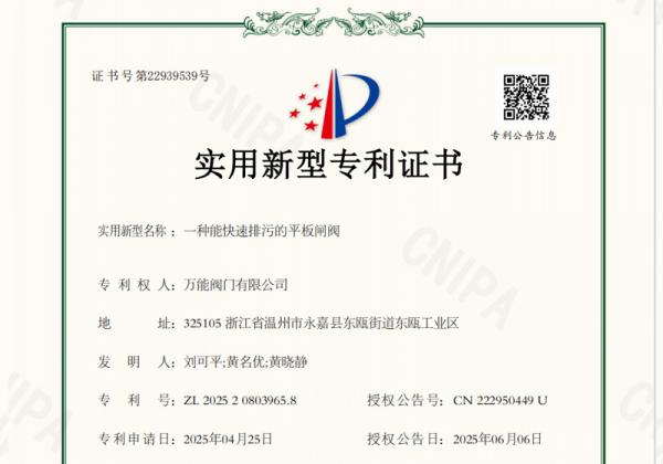 近日,萬能閥門有限公司成功獲得了一項關于快速排污平板閘閥的專利。專利號為ZL 2025 2 0803965.8,授權公告號為CN 222950449 U。這項新技術的獲得不僅進一步鞏固了公司在閥門領域的技術優(yōu)勢,也為市場提供了更高效、更環(huán)保的排污解決方案。